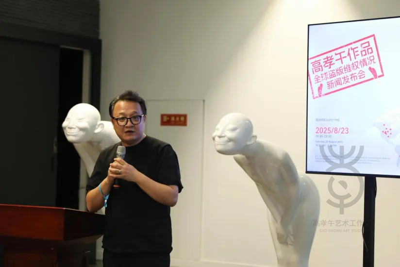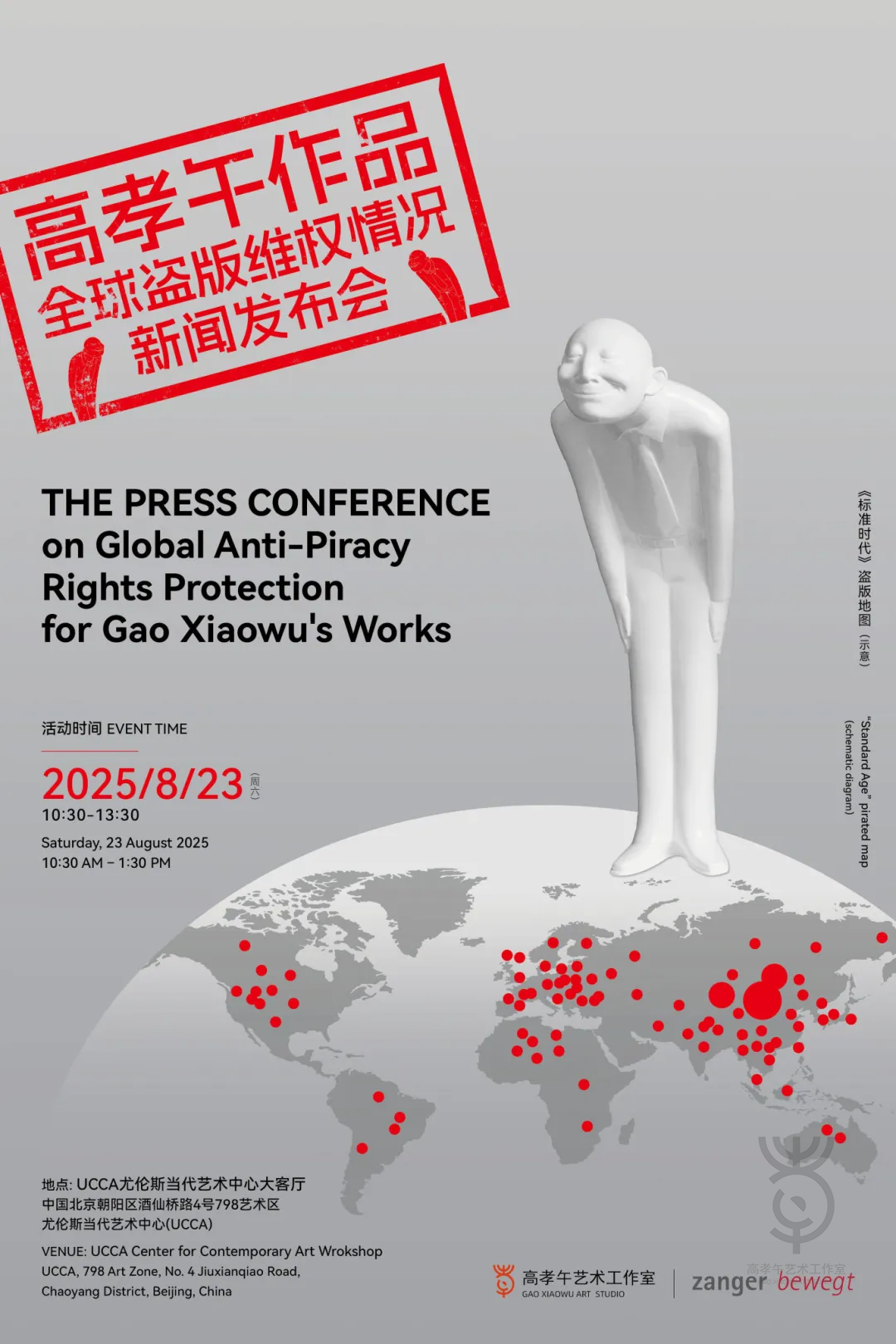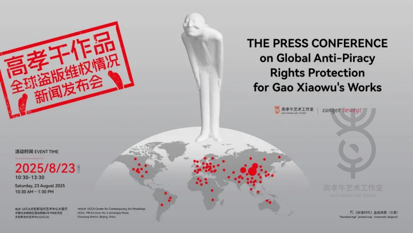 2025年8月23日,由高孝午艺术工作室和奥地利章格律师事务所(Zanger-Bewegt)联合主办的《高孝午作品全球盗版维权情况新闻发布会》,在UCCA尤伦斯当代艺术中心大客厅举行。艺术界、设计界、法律界、跨文化传播等领域知名专家学者,北京七九八文科新消费发展中心负责人,中国版权协会、反剽窃基金代表和媒体记者80余人,共同见证和探讨高孝午为典型个案的中国原创艺术在世界范围的知识产权保护和发展之路。