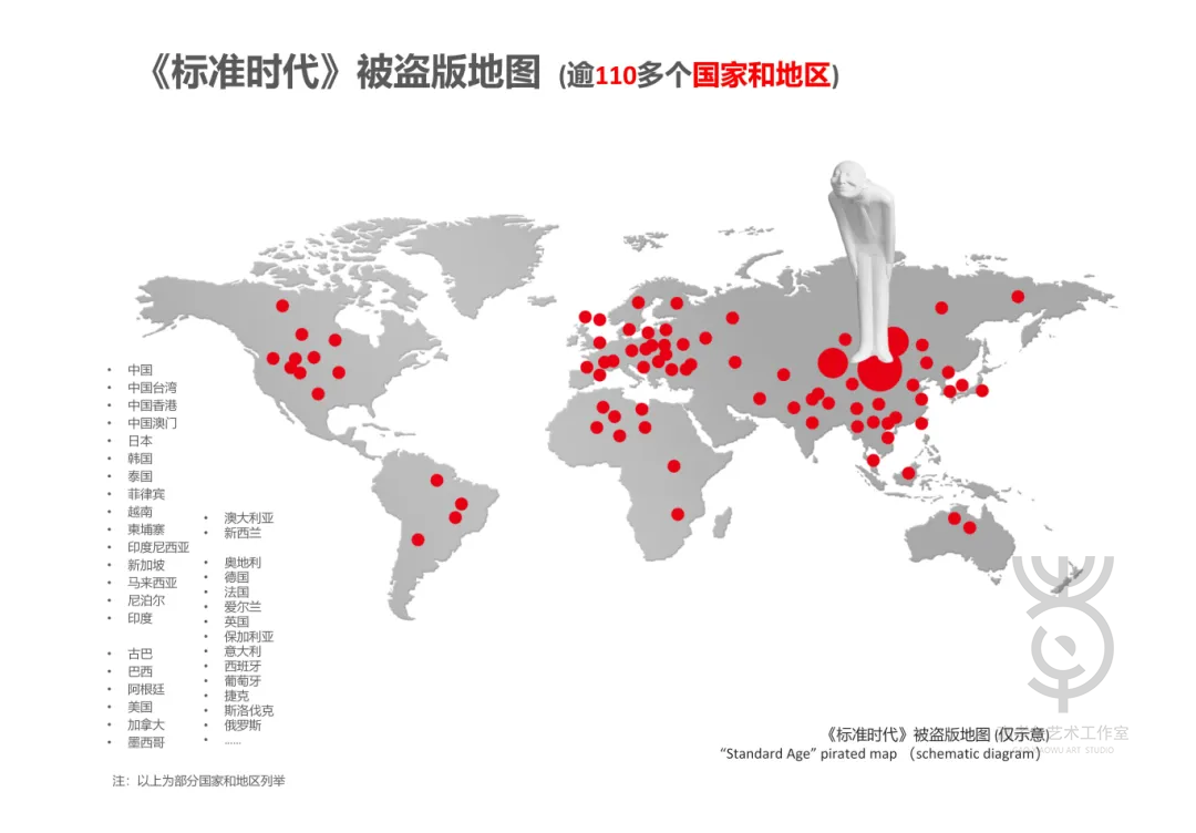 高孝午代表作《标准时代》,于2004年首展发布,自2008年首次在北京发现盗版后,至今17年来已先后在全球逾110多个国家和地区发现大量盗版。《标准时 代》因太过经典而成为了广泛借鉴效仿、直至全球山寨盗版的“地球人都见过” 的流行艺术样式 ,并已然成为全球跨文化、跨族群、跨语境演绎的现象级文化 事件。近年,高孝午《城市梦想》、《再生》、《宠神》等系列作品,也陆续在全球 多个国家和地区出现盗版。高孝午因此被媒体报道为“被全世界盗版最多的中国 艺术家”。